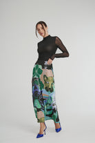 The Slip Skirt featuring the hand-painted JUNGLE print has a sleek concealed waistline and flared flowing hem finish for an elevated look.