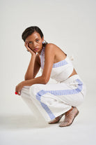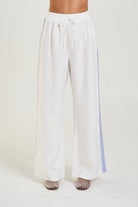 A classic white Wide Leg Pant made from a linen and rayon blend boasting an elastic drawstring waistband and embroidered SS Sol Script trim down the sides for an elevated finish.